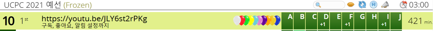 작년에 놀랍게도 예선 1등을 차지하였다. 어떻게 한 건진 잘 모르겠다. 아무튼 그래서 올해 팀명을 예선 일등 딱대라는 뜻으로 "예일대" 라고 지었는데, 결론부터 말하면 아쉽게도 하지 못 했다. 그래도 3등 정도면 상당히 잘 한 거기 때문에 만족한다. 그리고 1, 2등 팀은 ICPC에 참가하지 못 하는 팀이기 때문에 사실상 1등이라고 할 수 있다.