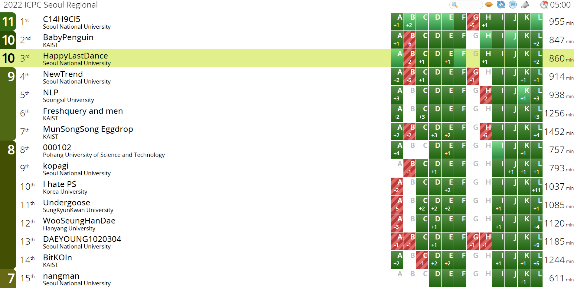 10솔브로 3등을 기록했다. (서울대 2등) 2등하고 페널티가 13분 차이인데, "딱 1번만 덜 틀렸으면" 하는 생각이 들지만 어차피 결과론이다. 그렇게 따지면 2등 팀도 1번 덜 틀렸으면 똑같은 거니까.. 그리고 중요한 것은 꺾이지 않는 마음 학교 내 순위는 바뀌지 않는다는 것이다.
